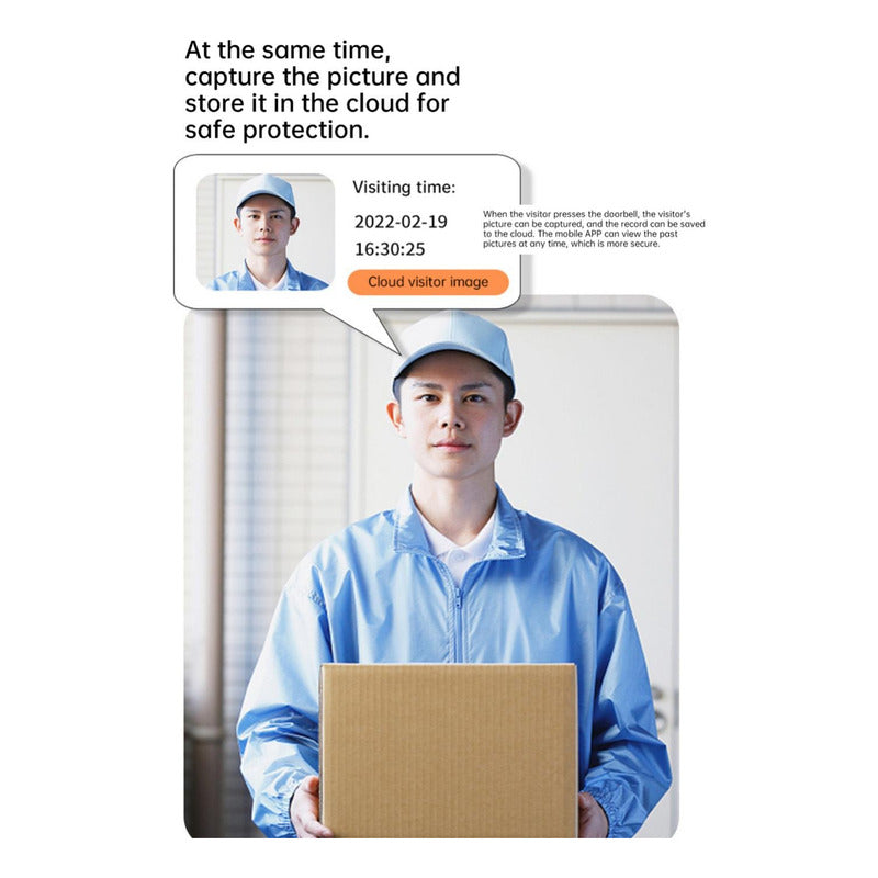 conectar al wifi 4g o anteriores no funciona con 5g timbre inalámbrico WiFi para exteriores, cámara HD, timbre de puerta de seguridad, visión nocturna, intercomunicador de vídeo, cambio de voz para el hogar, Monitor, teléfono de puerta Características: 2. Batería recargable incorporada 3. Apoye el cambio de voz, las voces de las mujeres en las voces de los hombres 4. Instalación conveniente, se puede pegar, se puede perforar 5. Luces de visión nocturna 850N incorporadas, la noche también puede ver muy claramente 6. Dingdong tiene 19 música, sonido ajustable Parámetro: Nombre: timbre inteligente visual, 300.000 píxeles, 480P Material: materia prima ABS, PCBA, batería de polímero, altavoz, cámara, hardware Capacidad de la batería: 1000mAh de timbre, dingdong con cable USB para trabajar, sin batería Entrada de energía: 5V = 2A Tiempo de uso: más de 6 meses de uso normal Tiempo de carga: 1,5 horas Mantenimiento de registros: gratis tres días de almacenamiento permanente, tiempos ilimitados durante 3 días Tipo de intercomunicador: color visual Tamaño de la máquina de timbre de puerta: 85*53*24 Tamaño de la máquina Dingdong: 55*42*13 Nombre DE LA APLICACIÓN: Tuya Lista de embalaje: 1 * máquina de timbre de puerta 1 * máquina Ding-dong interior 1 * cable de carga 1 * Pegatina de instalación auxiliar 1 * tornillo pequeño 1 * Instrucción Recordatorios: * El botón no se puede colocar en una puerta de hierro porque interferirá con la señal. * Nuestro timbre no admite red wifi 5G.