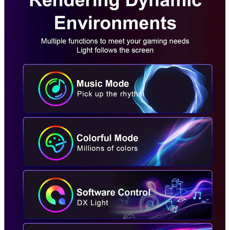 Transforma tu experiencia visual con la Cinta LED para TV, diseñada para sincronizarse con la música y crear un ambiente envolvente en tu hogar. Con un tipo de LED 5050 y una longitud de 25 cm, esta cinta es perfecta para realzar la atmósfera de tus noches de cine o tus sesiones de juego. Con un voltaje de funcionamiento de 5V y 60 LEDs por metro, ofrece una iluminación vibrante y eficiente. Su controlador de color te permite personalizar la iluminación según tu estado de ánimo o la temática de tu evento, brindando una experiencia única y dinámica. Compatible con la aplicación dxlight, puedes controlar la cinta de manera sencilla desde tu dispositivo inteligente. Aunque no cuenta con Wi-Fi, su integración con asistentes virtuales te permitirá disfrutar de una experiencia de usuario fluida y moderna. Ideal para quienes buscan una forma innovadora de iluminar su espacio, esta cinta LED es una opción versátil que se adapta a diferentes entornos. Dale un toque especial a tu hogar y disfruta de la magia de la iluminación inteligente. TIRA DE LUZ LED TRASERA PARA PC MOD.DX23014-BT Solo tres pasos para su instalación. La misma cinta trae consigo el adhesivo necesario para la adherencia al monitor. Posee modo de sincronización de sonido, donde las luces se sincronizan con el ritmo de la música. Además, posee modo de sincronización de color con imagen, entregando una mayor experiencia visual. Especificaciones: Material: silice+ ABS Tipo de LED: 5050RGB + IC Cantidad de LED: 60Led / metro Voltaje de entrada: DC5V Voltaje de salida: DC5V Potencia: DC5V 2A Max10W Variables: - 25X45X25 centímetros