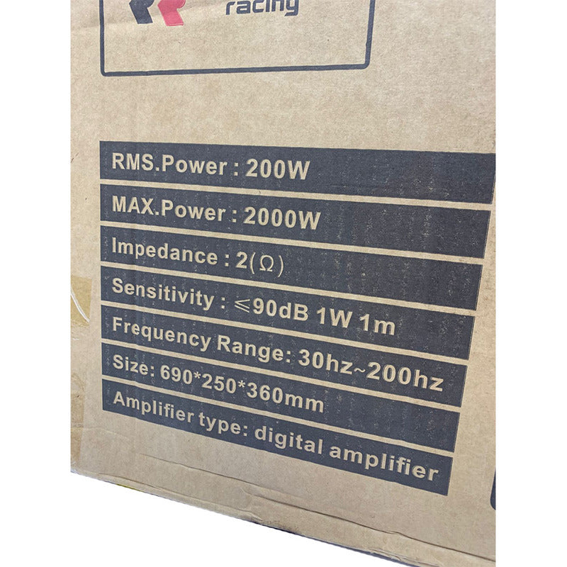 Especificaciones Potencia máxima: 1000 W Potencia de entrada: 100 W Rango de frecuencia: 40 Hz a 140 Hz Sensibilidad: 90 dB Material del Woofer: Pulpa Tipo de bobina de voz: Alambre redondo de cobre de 4 capas Tipo de bobina de voz: Poliimida Imán: Ferrita Peso: 9,5 Kg