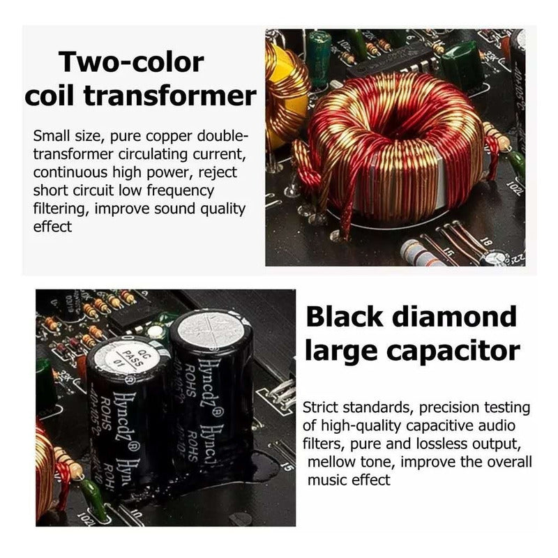 Amplificador de potencia para coche con 2 canales y 2200 vatios de potencia. Clase de amplificador: Clase A/B. Cuenta con envolvente estéreo. Altavoz principal push 2. Incluye subwoofer pasivo. Diseño delgado para una fácil instalación. Proceso de dibujo de fundición de aleación de aluminio para mayor durabilidad. Incorpora un disipador de calor externo. Protección contra sobrecarga térmica y corta del altavoz. Especificaciones técnicas: Modelo: N368. Fabricado en aleación de aluminio. 2 canales para una mejor distribución del sonido. Voltaje de funcionamiento: CC 10-16V. Salida de potencia máxima: 2200W. Distorsión Armónica Total (THD) Salida RMS: <0.1%. Ganancia bajo: 0-12db. Relación señal-ruido (SNR): >95dB. Sensibilidad: 150mV. Impedancia: 2O ~ 4O. Frecuencia: 20Hz ~ 20KHz. Dimensiones: 230*242*53mm.