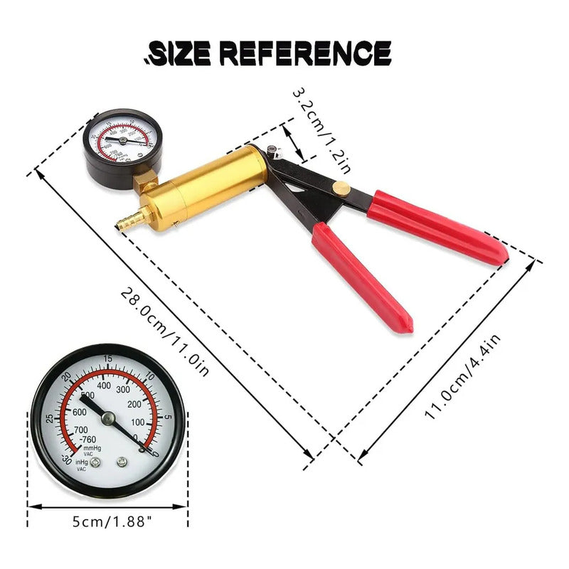 Profesional para drenar el aceite de frenos de vehículos automotores y probar el sello de la bomba de frenos para garantizar un viaje seguro. El kit de bomba de vacío puede probar todo tipo de ajustes y equipos importantes. Conecte mangueras y adaptadores para que funcionen con la mayoría de los vehículos y comprueben los sistemas de vacío y frenos. La función de la bomba de vacío es producir presión negativa, aumentando así la fuerza de frenado, como herramienta de drenaje del aceite de frenos. Perfecto para frenar y purgar combustible. Con una bomba portátil, de doble escala, fácil de leer. Se suministra en funda de transporte para facilitar el transporte y el almacenamiento. Tipo: kit de bomba de vacío Color: negro Material: plástico+metal Tamaño: manguera de vacío corta: 9,8 cm/3,8 pulgadas, manguera de vacío larga: 56 cm/1,8 pies, bomba de vacío con calibre: 28 x 11 x 3,2 cm/11 x 4,4 x 1,2 pulgadas (largo x ancho x alto) Garantía del vendedor: 1 meses