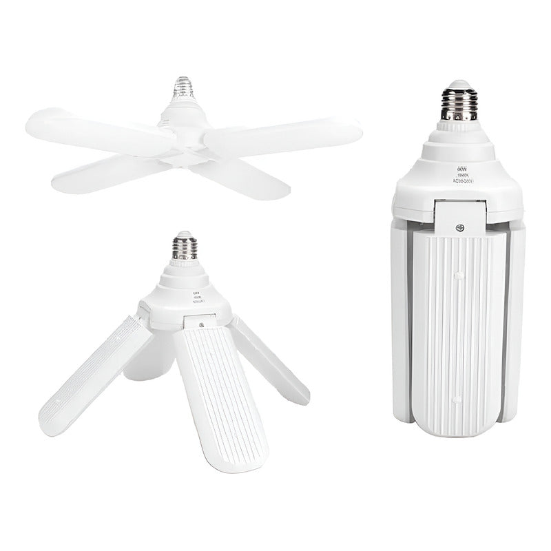 AMPOLLETA LED 4 ASPAS ÁNGULO AJUSTABLES GRAN ILUMINACIÓN 60W CARACTERÍSTICA Material: PC Color: blanco Color de la luz opcional: luz cálida, luz blanca Fuente de luz: LED Voltaje: 95-265V Potencia: 60W Tamaño: (diámetro) X(H) 10x10x25,5 cm(aprox) Diámetro abierto: 40,5 cm(apróx.) Proporcionará más de 3300 lúmenes 6500K luz blanca cómoda. Puede ahorrar más del 80% de energía en comparación con las luces incandescentes tradicionales. - Hecho de material PC, ligero y duradero. - Ampolleta de luz blanca ahorro de energía, brindando la mejor experiencia de iluminación interior. Consumir sólo 60W - Estas luces tienen un ángulo de haz muy amplio al ajustar la hoja de luz, lo que le permite ajustar a un ángulo adecuado. - No se requieren herramientas, como fijar bombillas a E27. Se conecta directamente a las bases e27. Ideal para el hogar, empresas y negocios Lámpara de alto brillo y ahorro de energía Temperatura de color: 6500k La ampolleta de aspas es ideal para el baño, cocina, garajes y bodegas. Si la conectas a un portalámparas portátil con cable la podrás ocupar como lámpara portátil para fotografía, trabajos de mecánica y hogar.